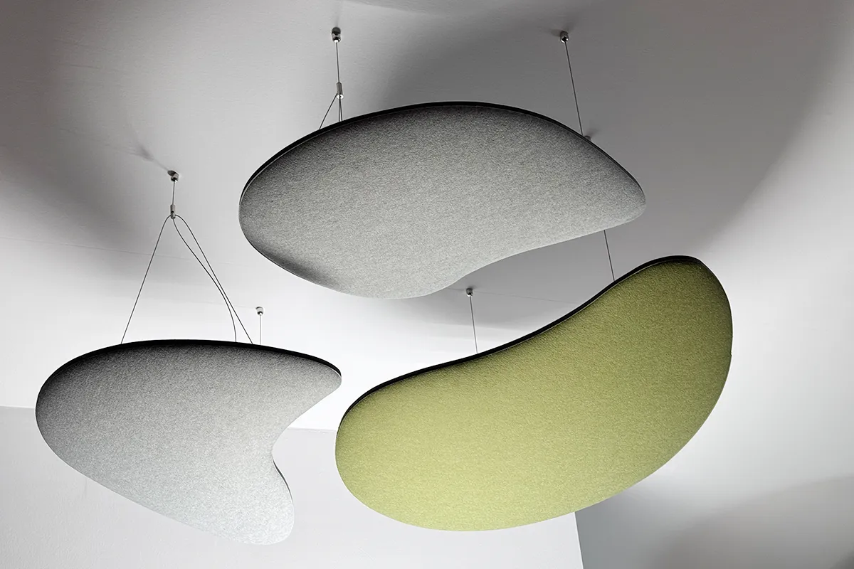 Viele Bürogebäude verfügen über klassische Odenwalddecken. Ein idealer Ausgangspunkt für eine verbesserte Deckenakustik. Bestehende Platten lassen sich einfach durch farbige akustische Deckenelemente austauschen. Auch für klimaaktive Decken bieten wir geeignete Lösungen an. Ergänzend können maßgeschneiderte Platten aus PET eingesetzt werden, die sich nahtlos in jede Decke integrieren lassen.
