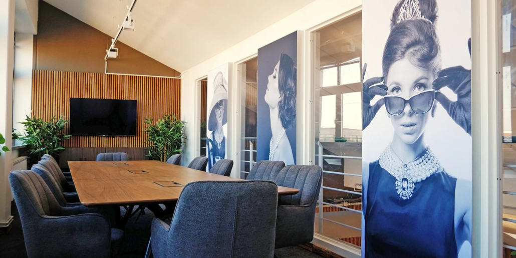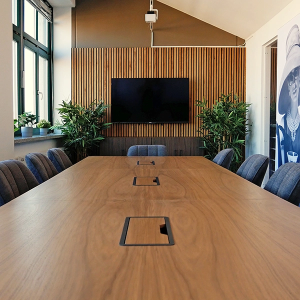 - Meetingraum mit akustisch wirksamen Paneelen und Wandbildern inkl. Ausstattung mit Möbeln