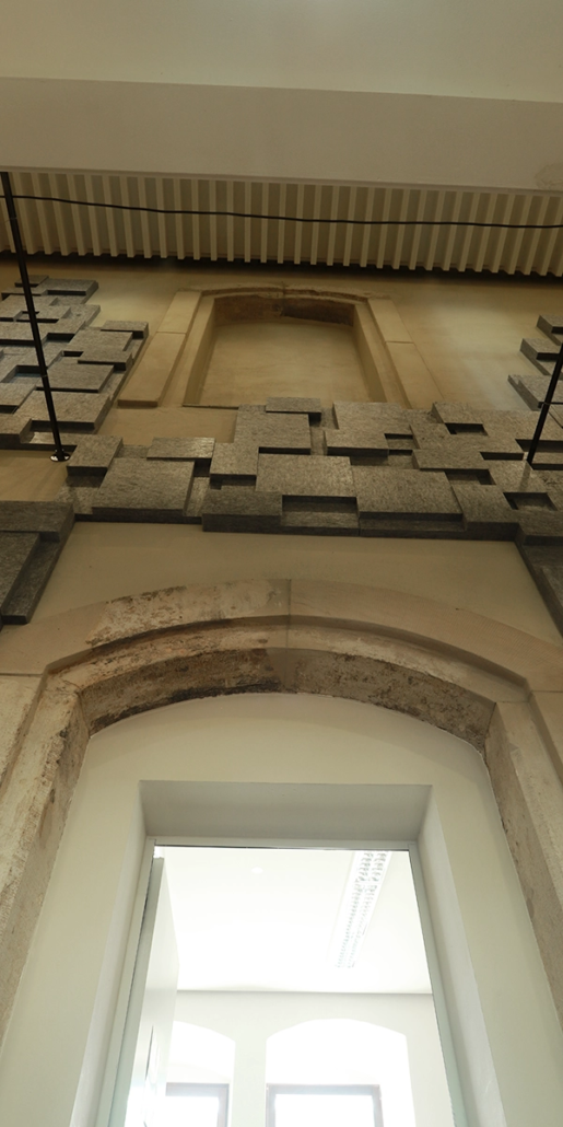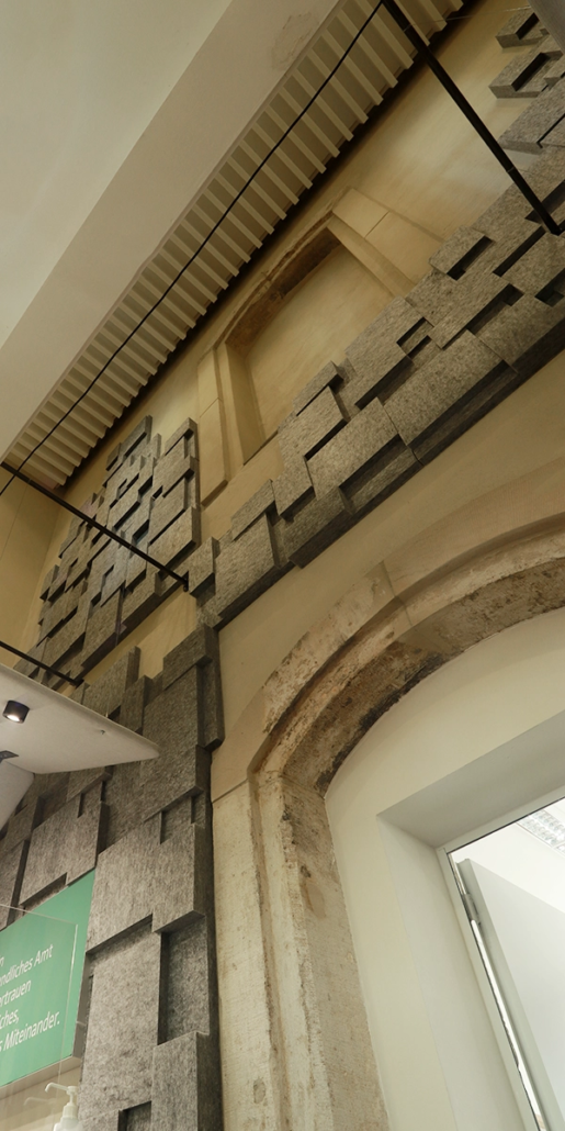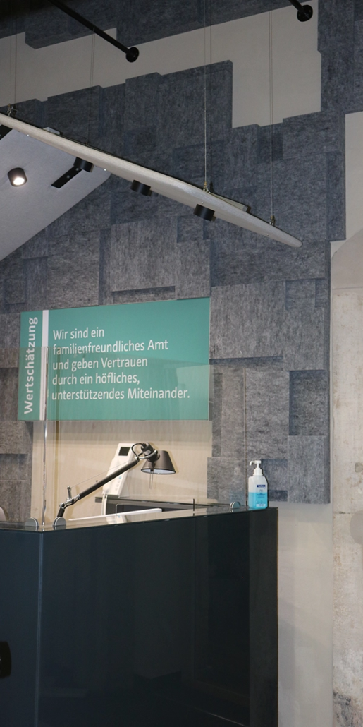 Umbaumaßnamen Akustikbaffel akustische Wandelemente mit 3D-Effekt aus recycelten PET Individualbau von Akustikdächern über den Arbeitsplätzen akustische Tischaufsätze